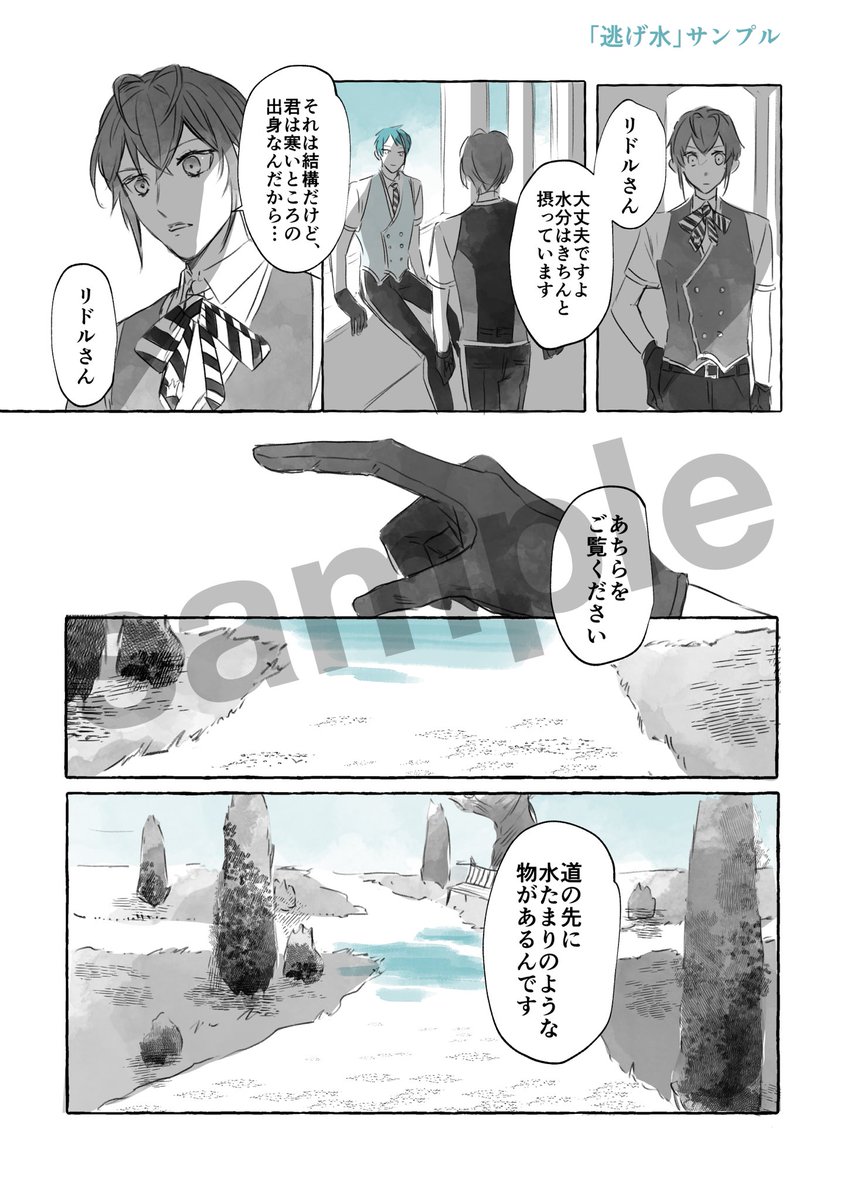 8/28 トレジェイ新刊「逃げ水」のサンプルです。 ※サンプルやや飛び飛びです。 5月に発行した「遠雷」と同軸ですが、単体で読めます。 ゲストページ含め全3話構成となってます。 A5/36p/2色刷 ※夏服捏造してます