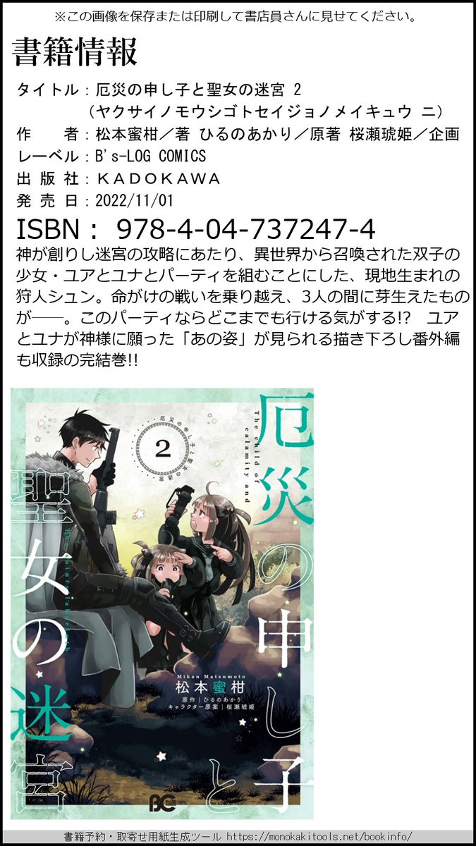 ところでじつはもうあと一週間ほど後、11月1日に『厄災の申し子と聖女の迷宮 2』が発売されます とりあえずamazon→amazon.co.jp/dp/B0BJJVHN4S/… 書店さん用の予約・取寄せ用紙も作ってみました↓のでご利用されるかたはこちらを保存して書店さんで見せてください