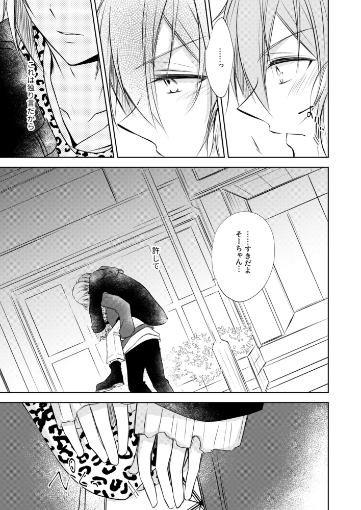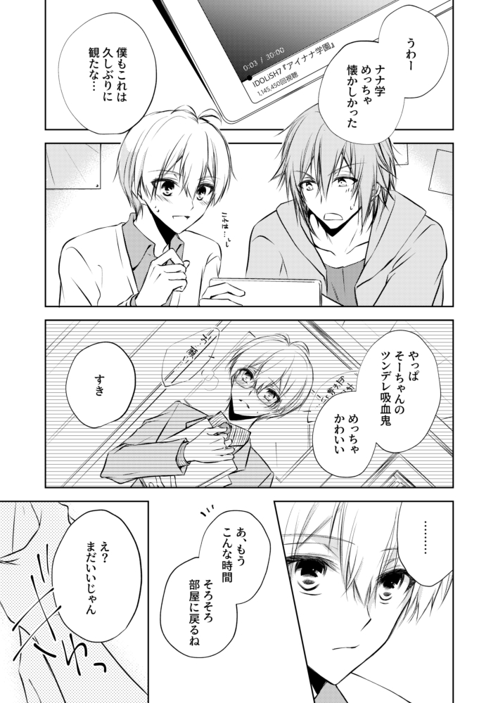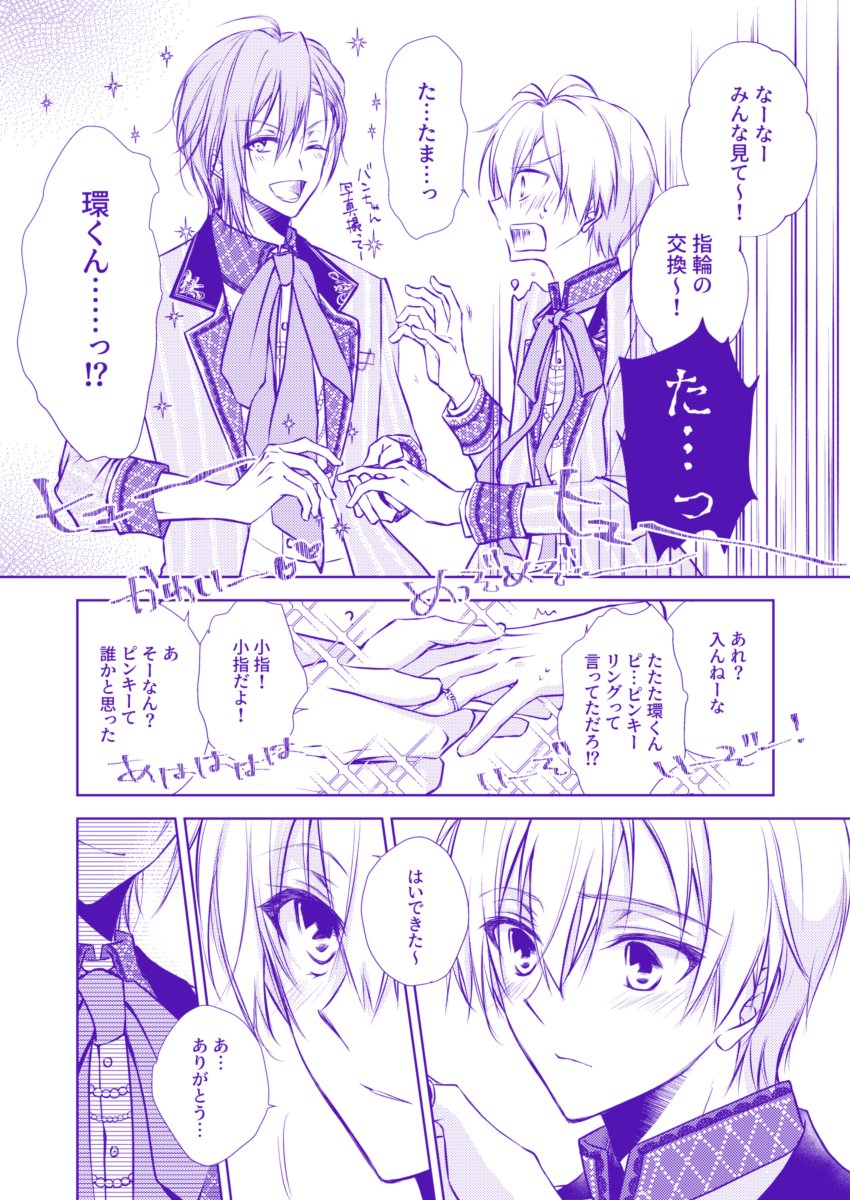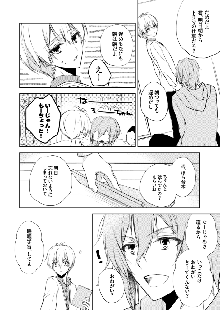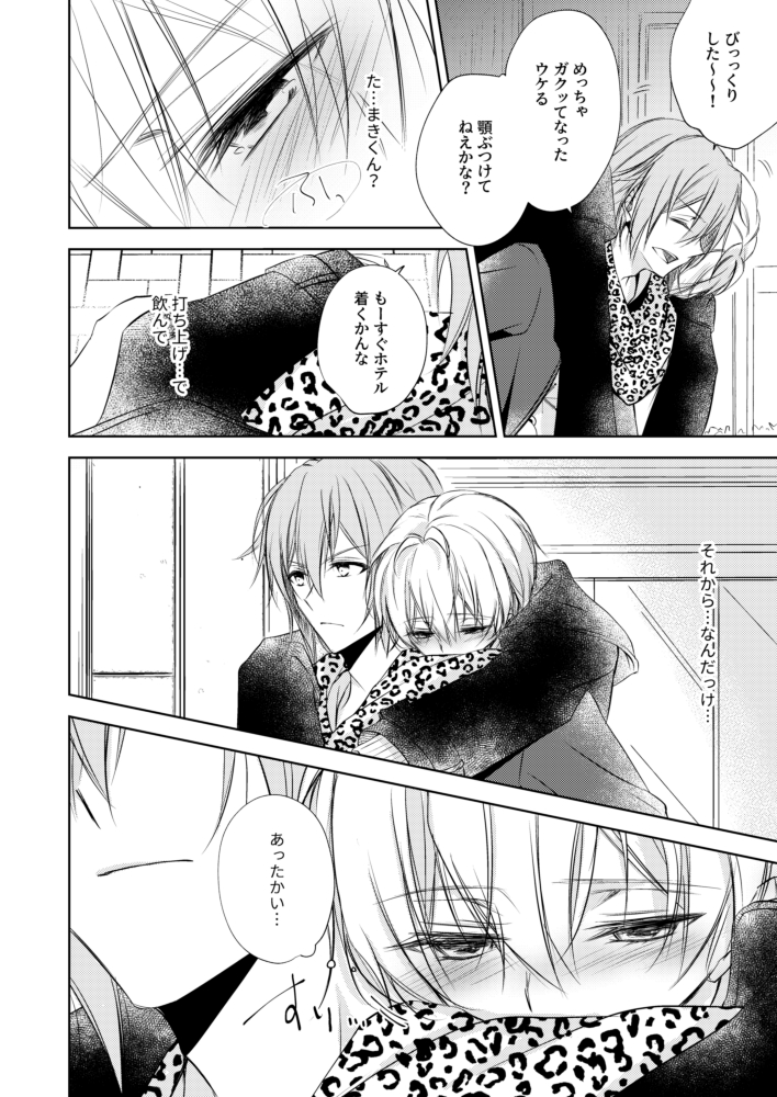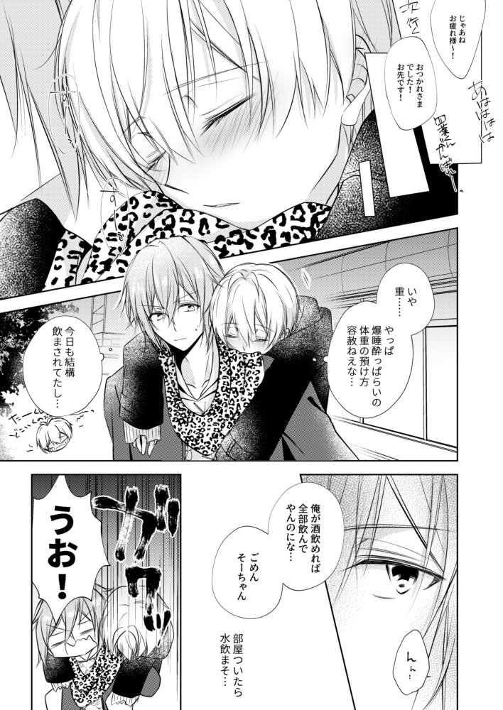 【3/21新刊サンプル/環壮/B5/P32/全年齢】 打ち上げの帰り道、酔って背中で寝ている壮五に小さく好きだとこぼしてしまう環。目覚めかけていた壮五はそのひみつの告白を聴いてしまい…というお話です。pixivはもう少しだけ読めます。 ぼくにだけ、あきるほどにひびかせて。 pixiv.net/artworks/97002…