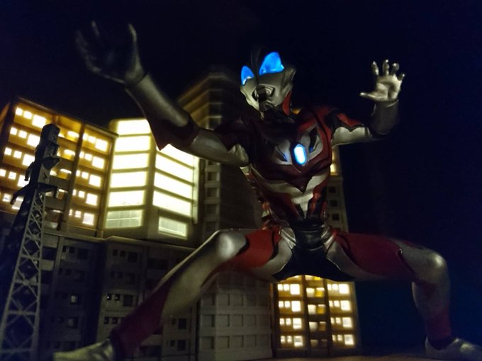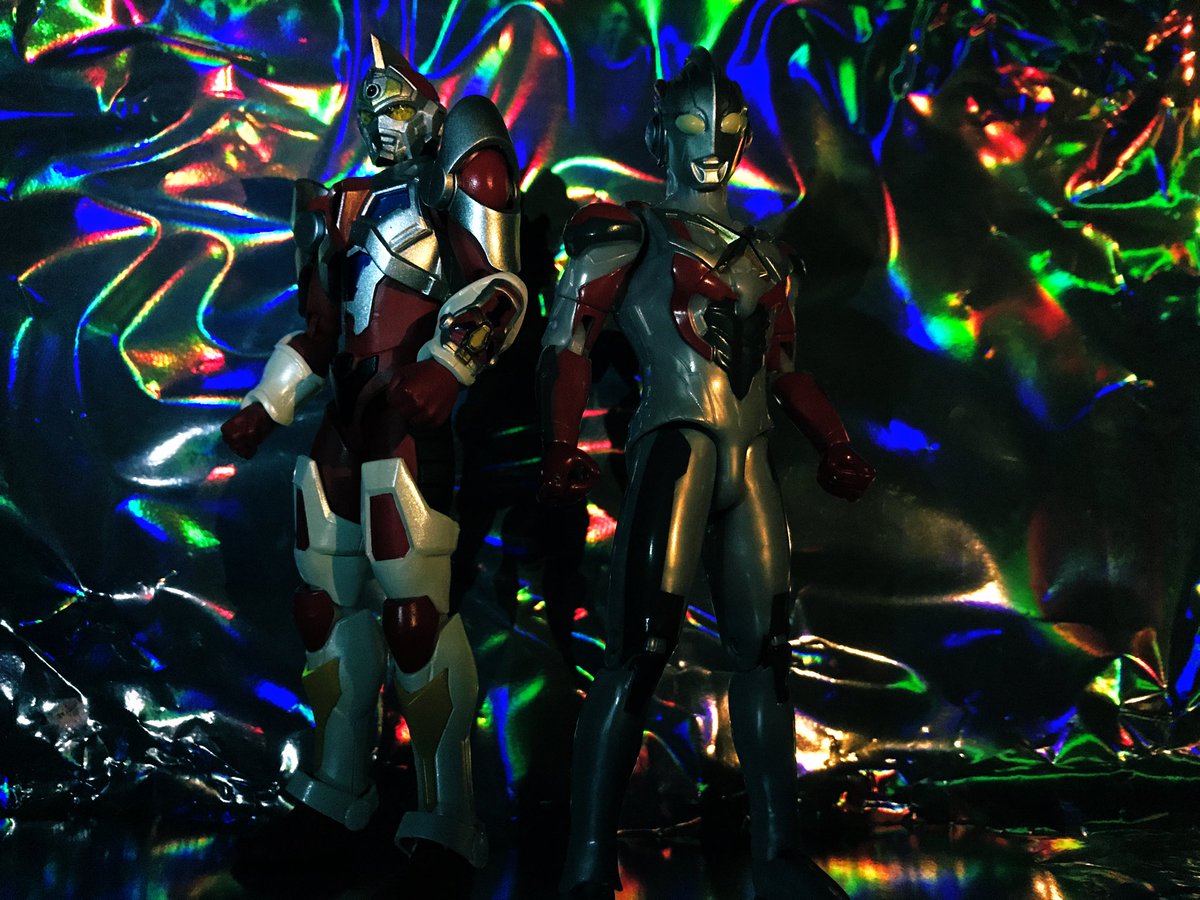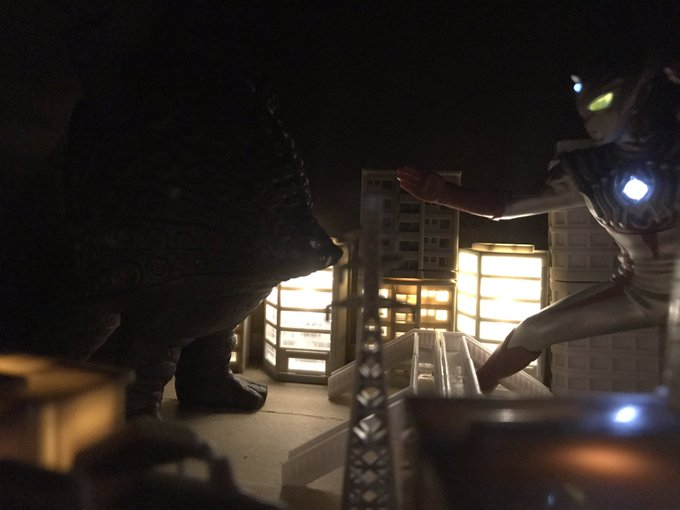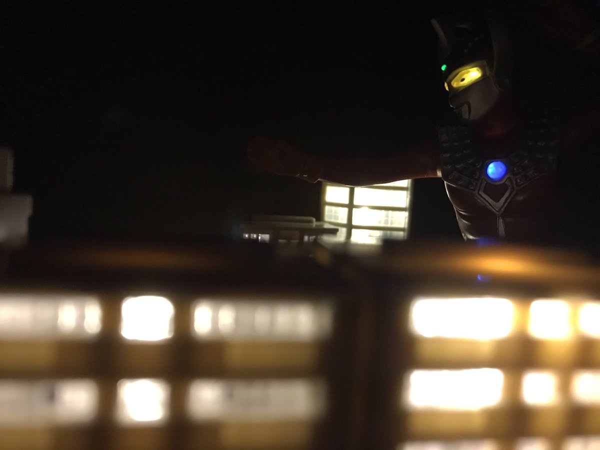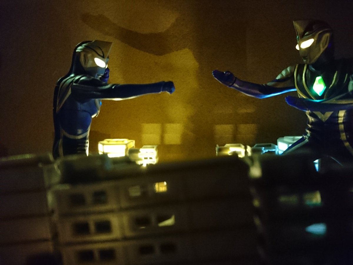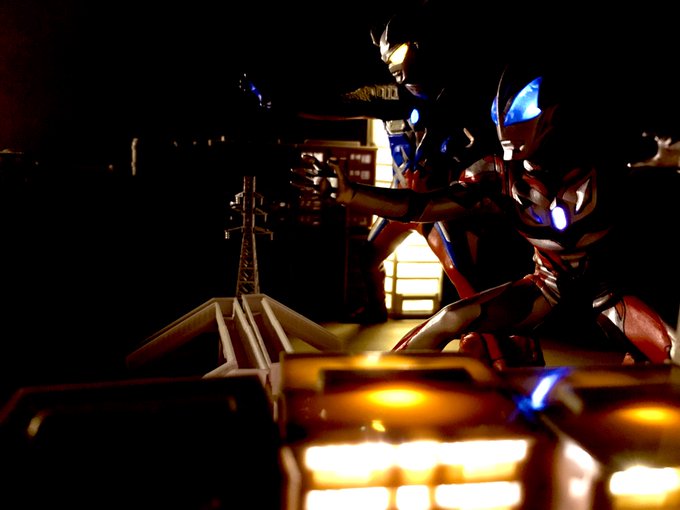 タロウ「行くぞ!タイガ!」 タイガ「はい!父さん!」 そして親子がここにいる #アルティメットルミナス #ウルトラマンタイガ #ウルトラマンタロウ #オモ写 #ちいさな巨大特撮 #夜のフィギュア撮影会