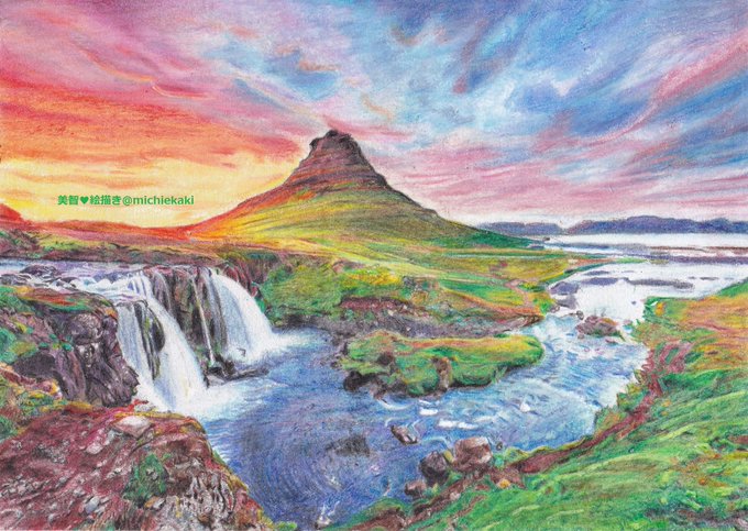 #2023年自分が選ぶ今年上半期の4枚 そもそも4枚くらいしかないねんけど…… #色鉛筆画 #ファンアート #風景画 #アイスランド #キルキュフェットル山 風景画は勿論だけど人物画も上手くなりたい。 元々は人の方が沢山描いてたんだけど塗り経験がないもんで(;^ω^)