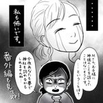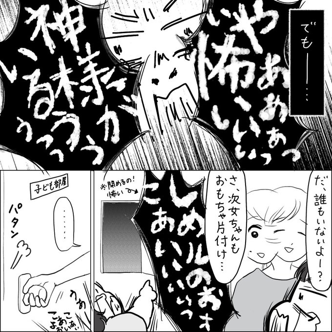 #フォロワーさんのこわ〜い体験談 第5話『神様との勝負』後編 (2/3) お子さんに神様の件は伝えていないのに、4歳の娘さんははっきりと「おもちゃ部屋に神様がいるから怖い」と言うそうです。 #怖い話 #怖い漫画 #漫画が読めるハッシュタグ