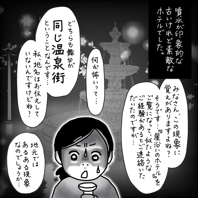 #フォロワーさんのこわ〜い体験談 第6話『言ってはいけない話』 (3/3) このときのホテルは、入り口に噴水のようなものがあってなんだか素敵で、でも年季は入っている印象だった、とのことです。 どこなんでしょうね… #怖い話 #怖い漫画 #漫画が読めるハッシュタグ