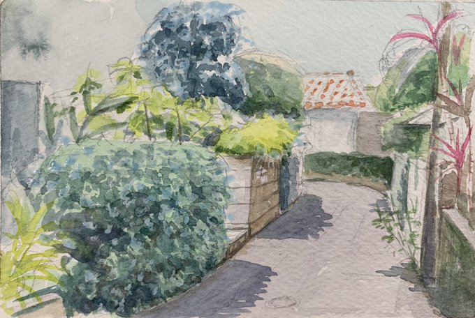 沖縄県中部中城村(ナカグスクソン) 「中城村民家の路地」 画材:透明水彩 サイズ:ポストカード 完成しました😊🌺 【minne】さんにて出品もしています minne.com/@nanjominsa #水彩画 #沖縄 #風景画 #ポストカードサイズ