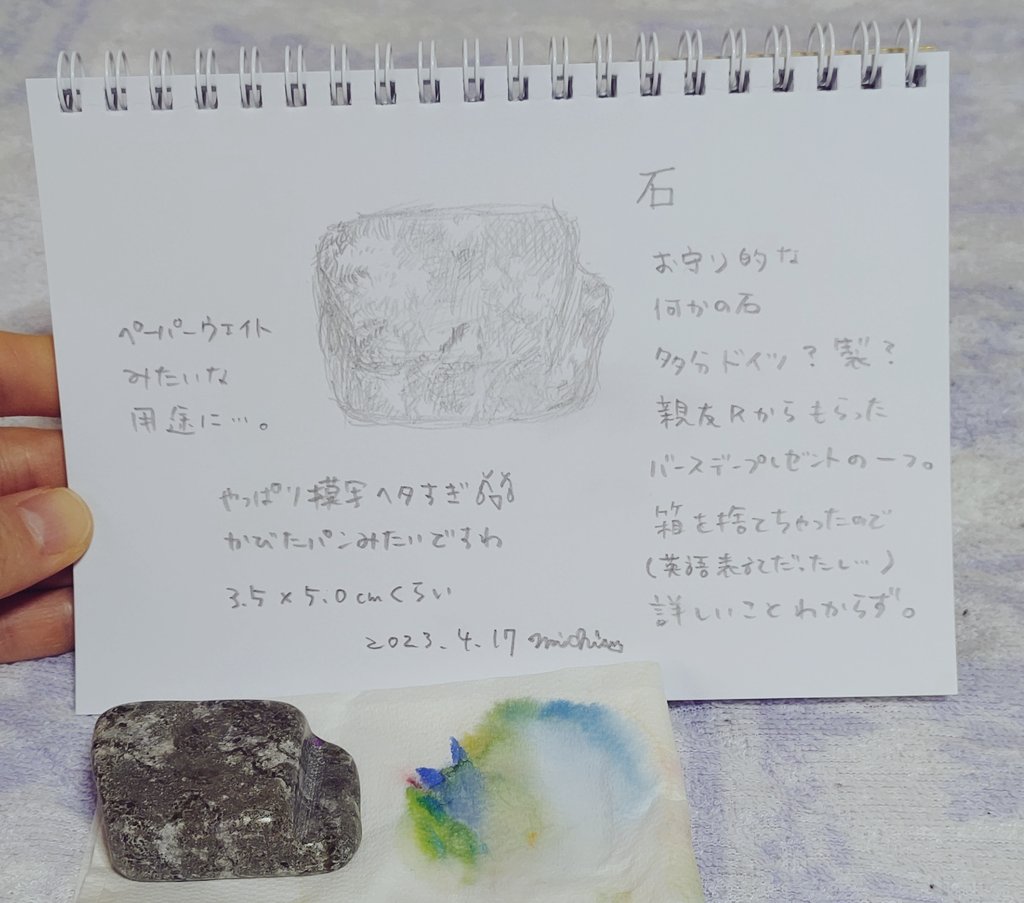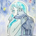 #ルーレットで絵を描こう 3、ゴースト×星×青 「寂しくない夜」 ボールサインiD(サクラクレパス)、水彩絵の具。 紙は、キャンソンモンヴァル中目。 夜は一人の幽霊さんも愛犬の像に寄り添う姿のドローイング🖌️ 夜空はシュミンケのツンドラブルーと下のほうはイツキさんの曙空を用いました。