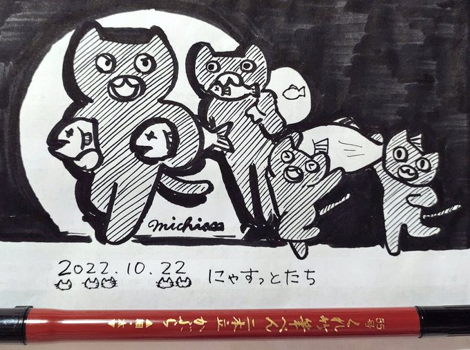 10月22日 強盗 「にゃすっとたち」 #Inktober_PerfectChallenge #kuretake_inktober2022 #inktober #inktober2022 くれ竹筆ぺん二本立かぶら55号、納品書裏紙。