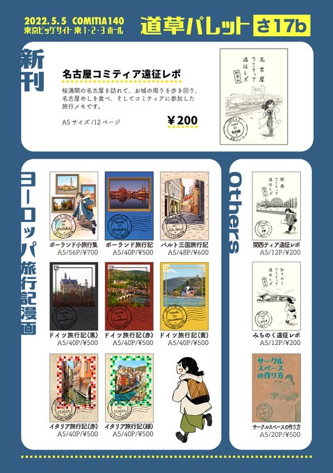 【5/5(祝) #コミティア140 お品書き】 新刊は名古屋遠征レポ。同じような遠征レポの既刊が2種と、ヨーロッパの旅行記漫画が8種、前回のティアズマガジンのプッシュ&レビューに掲載いただいた設営本の、計12種類です! 東2ホール『さ-17b』です。 よろしくお願いします! #COMITIA140