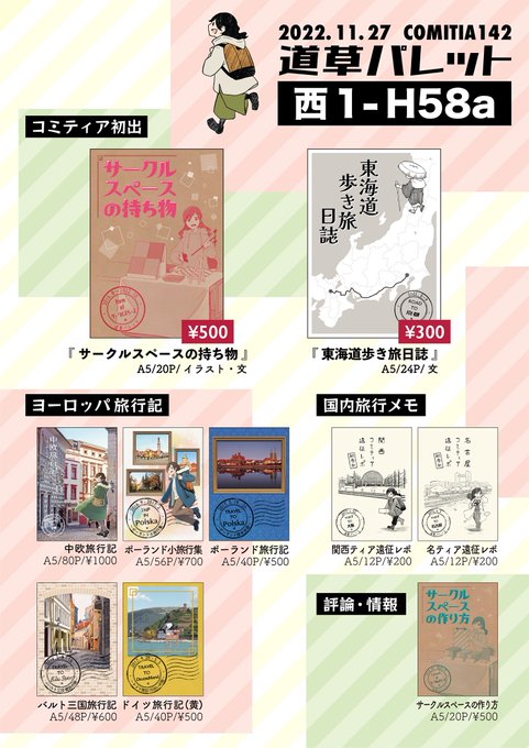 【11/27 #COMITIA142 お品書き】 コミティア初持ち込みの本を持って参加します。 設営本の続きみたいな本(これだけで読めます!)と、文章メイン少しイラストの東海道の本です。既刊のヨーロッパ旅行記などもよろしくお願いします。 西1ホール【H58a】でお待ちしてます! #コミティア142