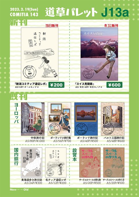【2/19(日) #COMITIA143 お品書き】 ◉新刊 新潟コミティア遠征レポ ◎コミティア初出 スイス旅行記(冬コミ新刊) 他にもヨーロッパの旅行記漫画や、設営本などいろいろ持って参加します! 東6【 J13a 】道草パレット どうぞお気軽にお立ち寄りください!よろしくお願いします✨ #コミティア143