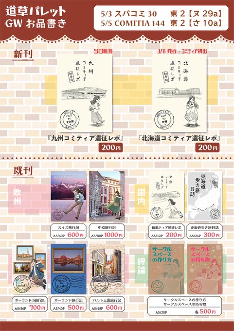 【GWイベント お品書き】 5/3 SUPER COMIC CITY30 東2『ヌ29a』 5/5 #COMITIA144 東2『さ10a』 GWは2つイベントに出ます。 新刊は先月の九州コミティアの遠征レポ! 既刊のヨーロッパ旅行記と設営本も持って行きます。 無配で東海道歩きの補完ペーパーも印刷して行く予定です。 #コミティア144