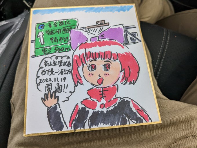 2 4 昨日開通した新山梨環状道路とばんきっきの色紙を描いてみたよー! ミニ色紙として300円で頒布するよ! 22/11/20 08:50