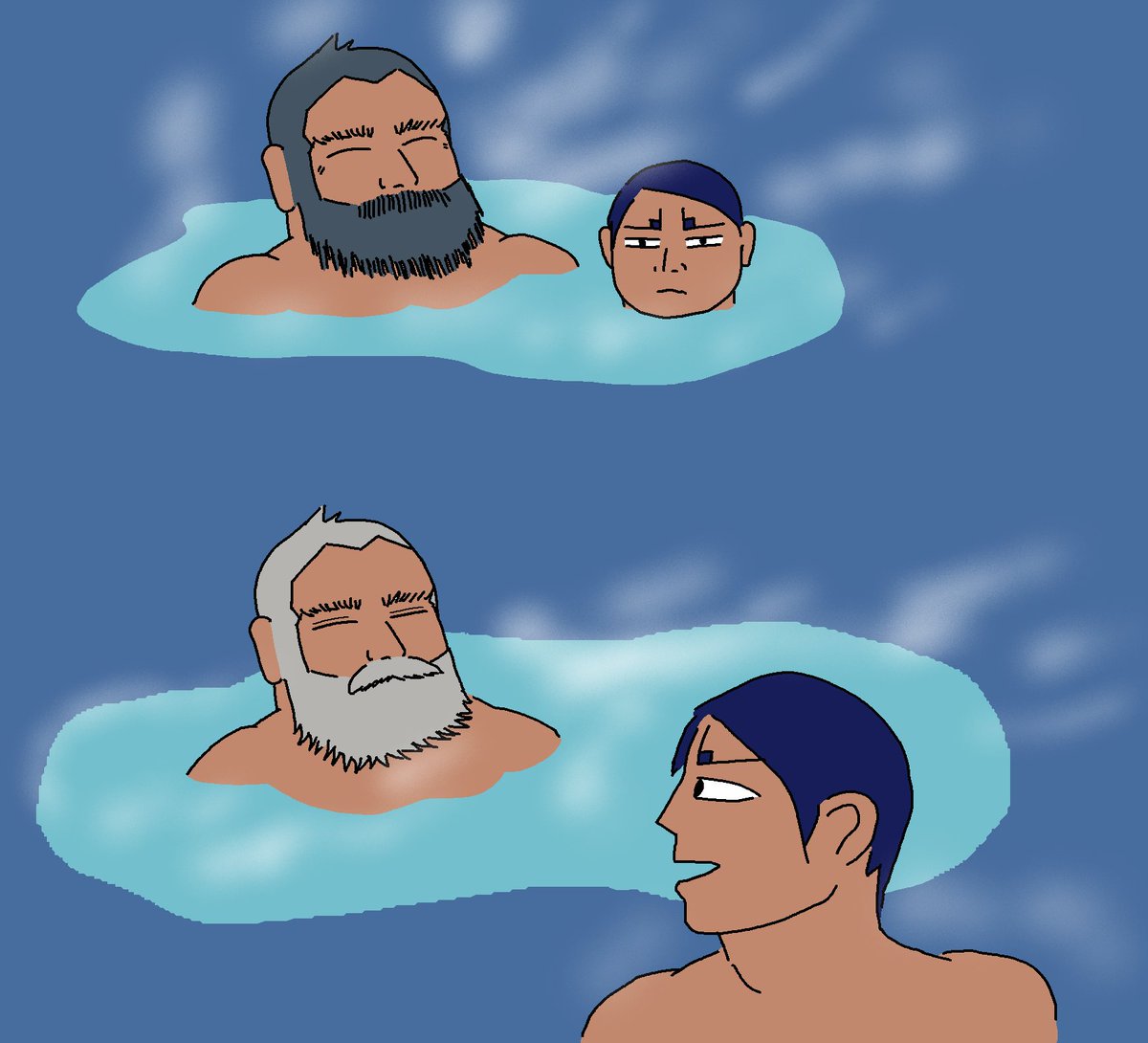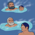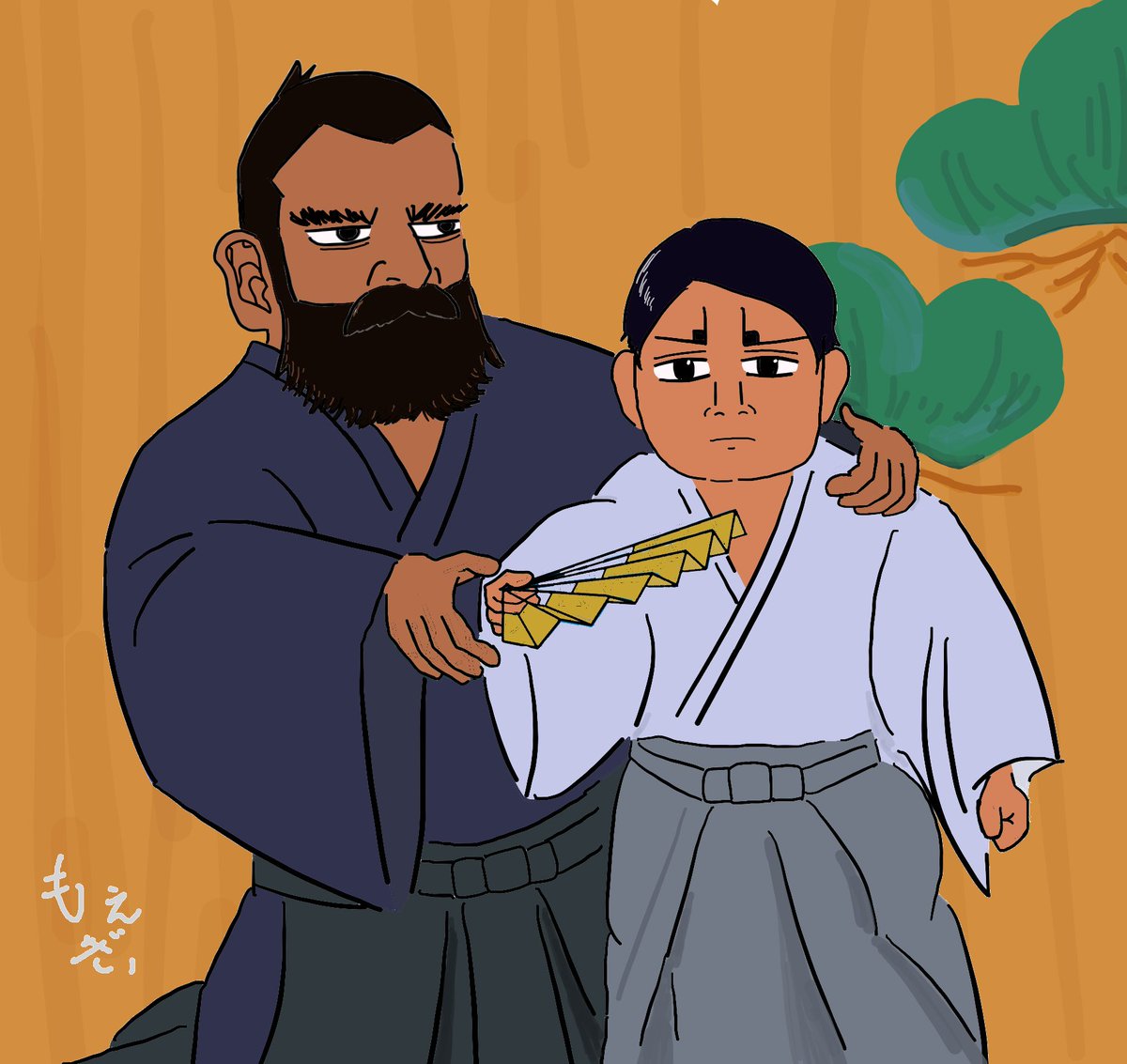 #2022年自分が選ぶ今年下半期の4枚 ①渚に遊ぶモスパパ、海浜三景 ②海水浴後の水浴びを覗かれるモスパパ ③モスパパの長寿の祝いに集まった鯉登兄弟(修整済) ④つるちゅバリに誘惑的なモスパパ