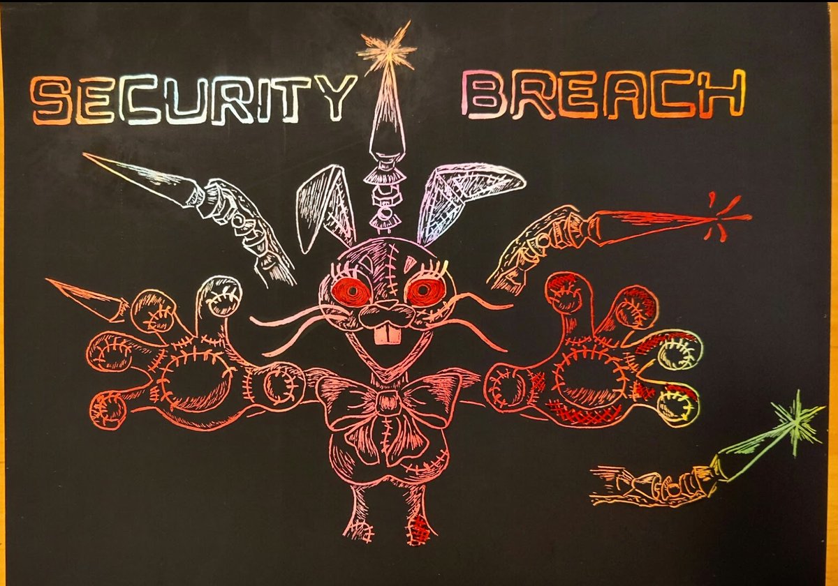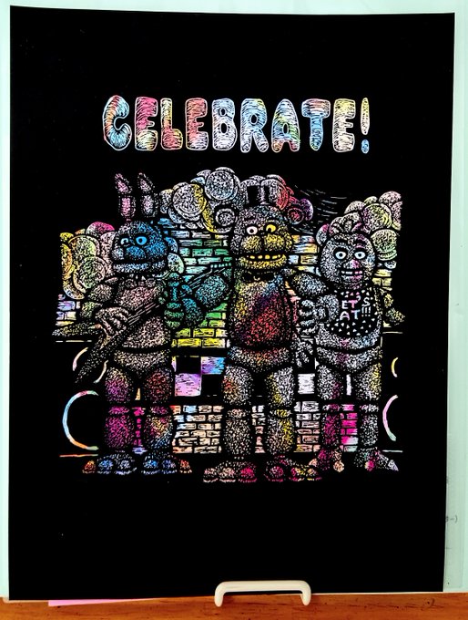 スクラッチアートで点刻(点描)の練習...FNAF1のあのポスターをば🤔✨立体感出てるかなぁ?💦割と良い感じとは思うけどついやりすぎちゃって陰影弱め?🤔… でもTシャツにしたら良さげな色合い✨ #FNAF #fnaffanart #スクラッチアート (【注】点刻の練習なのでトレース有)