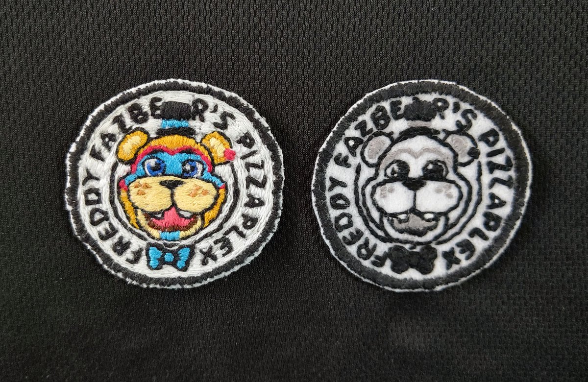 Freddy fazbear's Pizzaplexのワッペン!! (カラーver.&白黒ver.) 丸が…丸がめちゃめちゃ難しい…😭 #FNAFSB #fnaffanart #fnafgoods twitter.com/midokicchan/st…