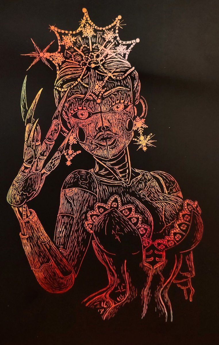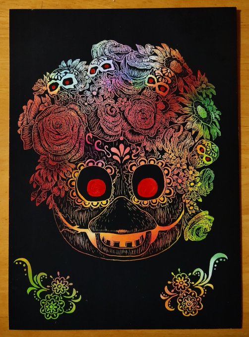 最近頑張ってない自分に悲しくなったので、昔1番頑張ってた時代のスクラッチアート並べて気合い入れ…🙄 ①FNAFARのCatrina Toy Chica ②Pinky Pills さんのFrost Ballora ③グリッチトラップのガワを被ったイシイニキさん ④自分の描いたヴァ二ー #fnaffanart #スクラッチアート