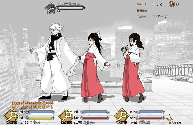 こっちは完全に趣味の歌姫先生と歌姫ちゃんで五条にバフかける、W歌姫な五歌システム。 第1再臨はおさげ髪でカセット付きマイクのモーションで頼む。(FGOトレス)