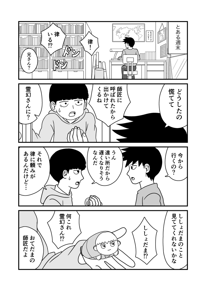 3 14 3/19 OH24 律霊新刊サンプルです。 律とししょだまが一緒に過ごすお話。サンプルにはいませんが霊幻も出てきます。 B5 全18P 200円 23/03/18 00:07