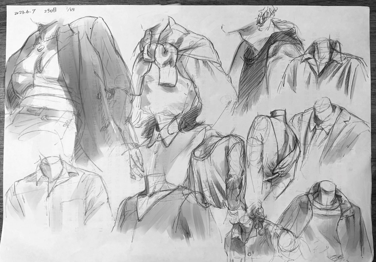 #クロッキー100日チャレンジ 23日目 首周り死ぬほど苦手だー。簡単な図形の組み合わせで組み立てるには構造複雑過ぎなんよ…そこに奥行きパース回り込みとか乗ってくる服の構造とかもうさ〜チクショー。描ける様になったらクソ楽しいに違いない