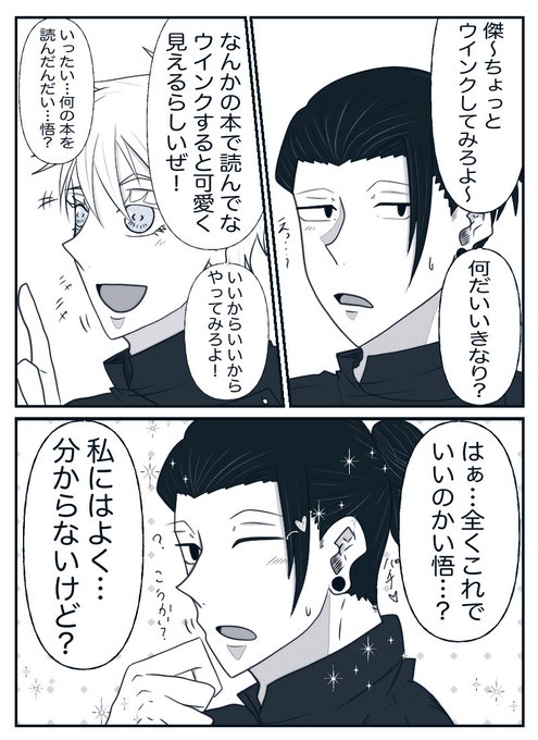 #五夏深夜のワンドロライ一本勝負 かなりのタイムオーバー申し訳ないです💦💦 お題「ウインク」です。 夏「本当に何を読んだんだい?」 五「硝子から借りた本?」 夏「あぁ〜なるほどね(悟…からかわれたな…)」