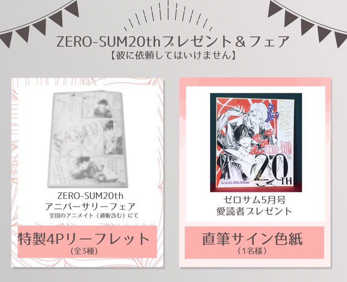 🎀ZERO-SUM20thアニバーサリーフェア🎀 全国のアニメイトさんにて特製4Pリーフレット(全3種)ランダム配布されます!詳細は👇 animate-onlineshop.jp/contents/fair_… 🎀直筆色紙プレゼント企画🎀 ゼロサム5月号の愛読者プレゼントにて1名様に直筆色紙が当たる企画が開催! 詳細は雑誌を✅