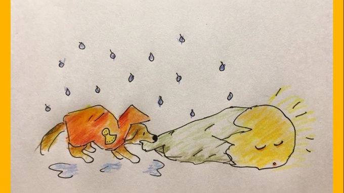 太陽さん、そろそろ起きて。 (雨雲退散を願ってお絵描きしてみました。はなはいつものカッパ着てます) #保護犬 #雑種犬 #保護犬を家族に #ペットショップに行く前に #イラスト #色鉛筆画 #rescuedog #adoptdontshop #illustration #colourpencildrawing #toomuchrain