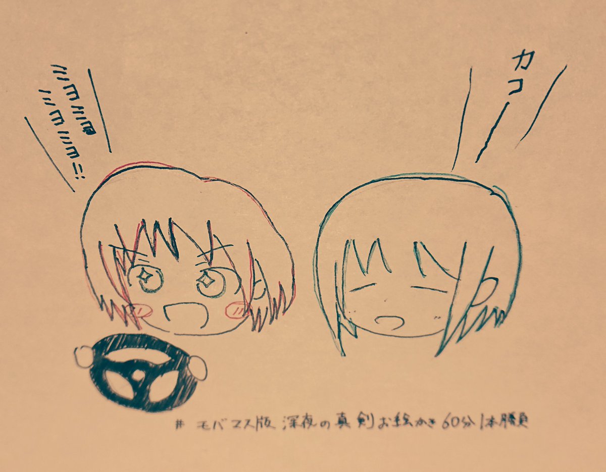 #モバマス版深夜の真剣お絵かき60分1本勝負 #鷹富士茄子 #原田美世 大遅刻 「ちょっとドライブしない?」と持ちかけ徹夜で1000km走ってもなお元気な原田美世と、ノリでついてきたものの顔面作画が溶けてきた鷹富士茄子の2日目の様子
