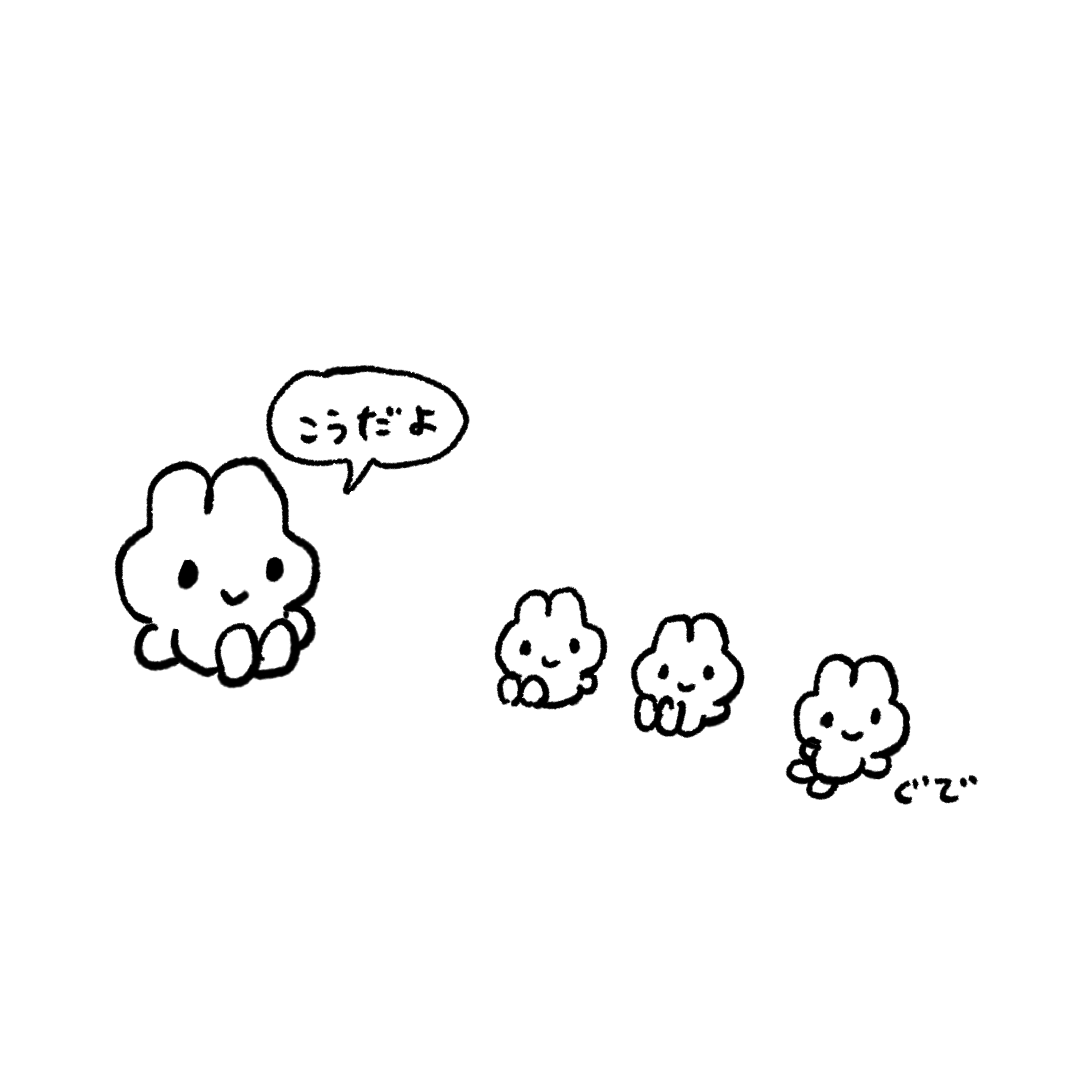 やさうさちゃんがぬいぐるみたちに座り方をレクチャーしているようです。ちゃんとおすわりできるといいのですが…