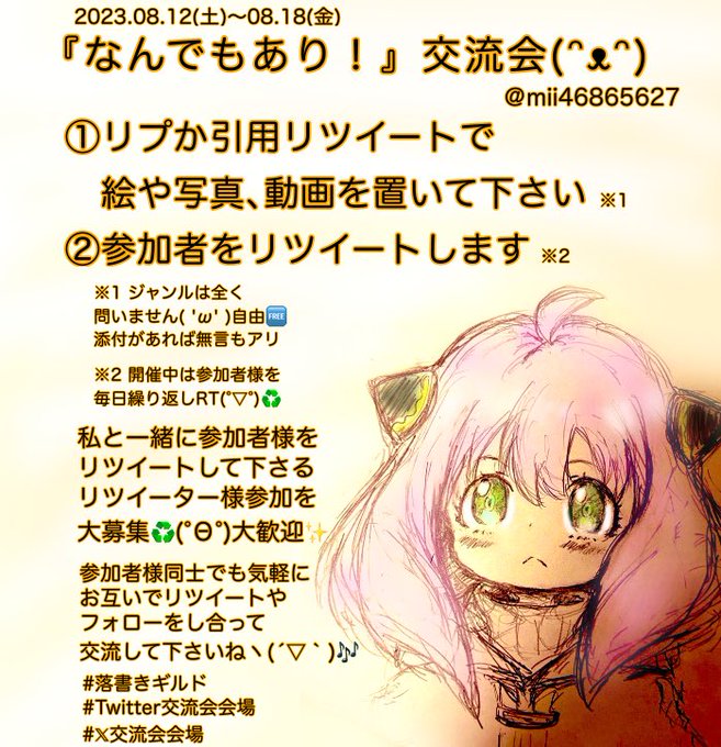 昨日まで開催した交流会に 沢山のご参加&閲覧&拡散協力を 本当にありがとうございました😊 少しでも良い交流のきっかけが 出来てたらリポストしまくった 甲斐があります♻️ヽ(´▽`)✨ いつも騒がしくてごめんね🥳w 🔽告知(ᵔᴥᵔ)🔽 今日のお昼から 『絵描き様交流会』を始めます #絵描きさん交流会 twitter.com/mii46865627/st…