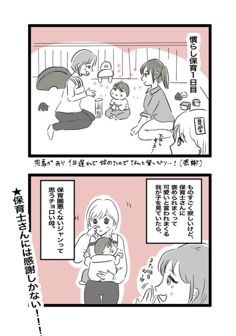 慣らし保育始まりました。 保育士さんは偉大です…! はーしかし寂しい…もう少し私だけの赤ちゃんでいてほしかったなぁ #育児漫画 #育児絵日記 #保育園初日