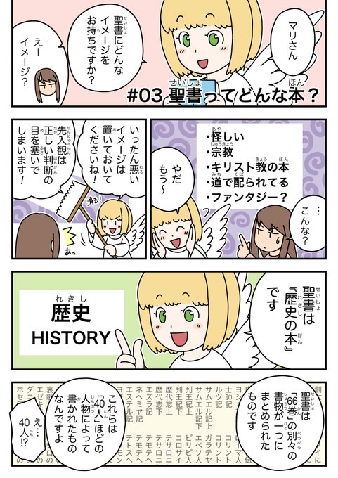 【ゆるく更新中】天使ちゃん聖書学習まんが 第3話「聖書ってどんな本?」 ↓漫画のメイキング動画もあります♪ youtu.be/-RppMJ1H5Rs #漫画 #絵描きさんと繫がりたい #漫画が読めるハッシュタグ #学習まんが #聖書 #天使ちゃん漫画