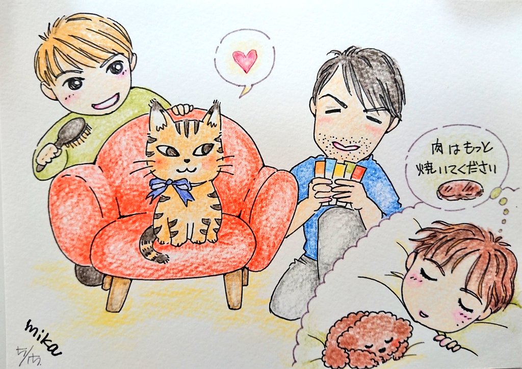 27 181 ステファン先生 お誕生日おめでとうございます🎂 素敵な一年になりますように🍀🐞🍀 (カシューにちゅーるを捧げる先生です💕過去絵) #ステファン・ランビエール 21/04/02 13:24