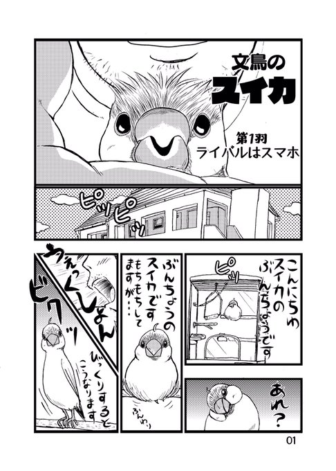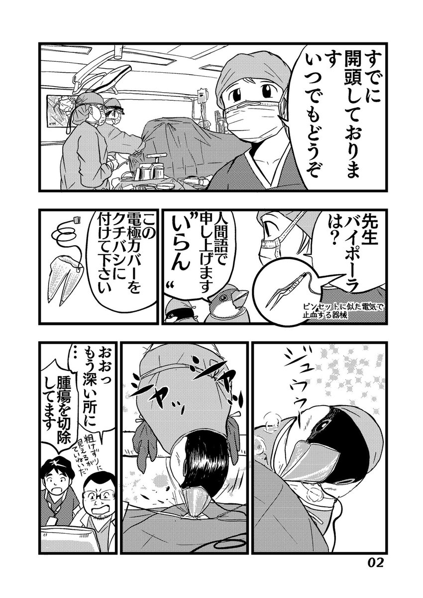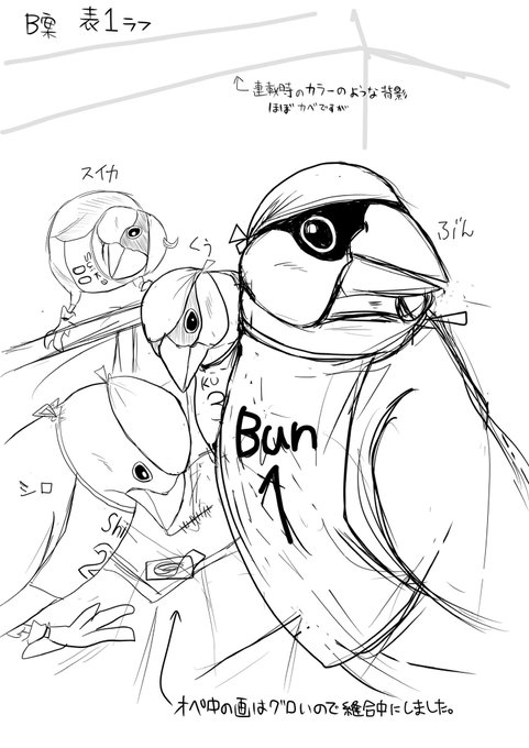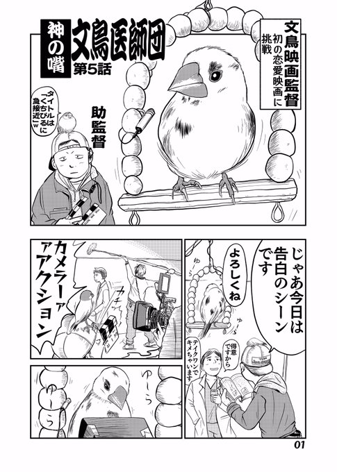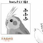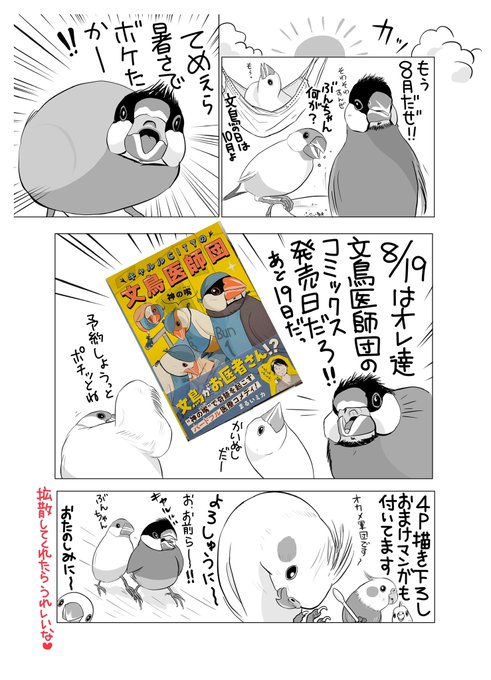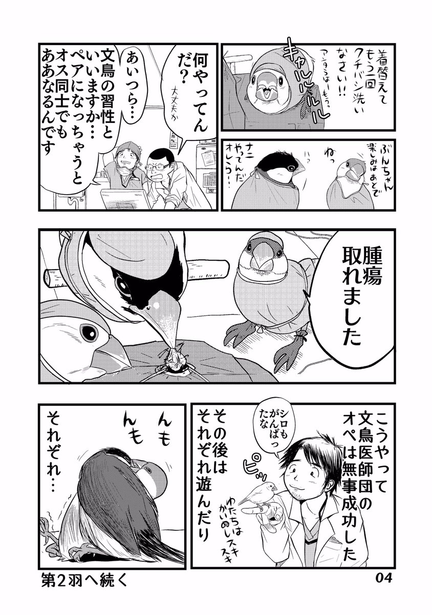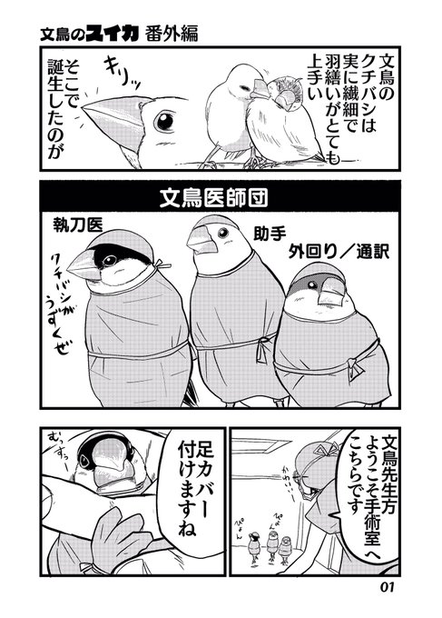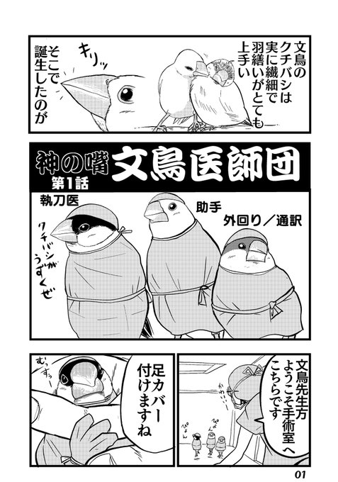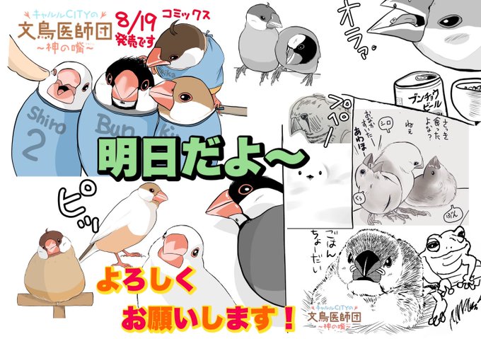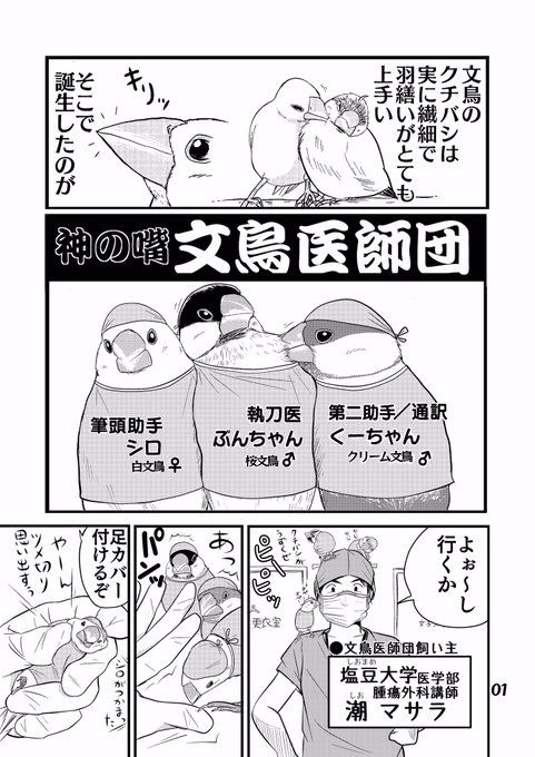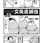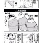 #漫画描きさんの自己紹介 素敵なタグありがとうございます。 文鳥が医師になった「文鳥医師団」を描いておりまして コミックスも出ております。(現在続編考え中) これは、まだ連載前に思いついた素となった4枚です。