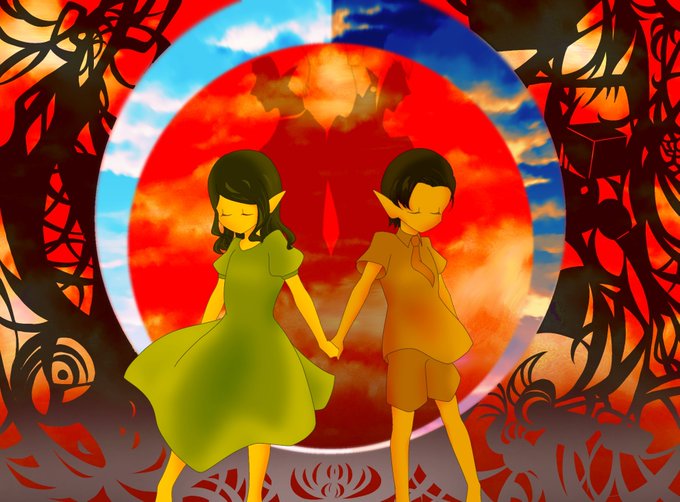 わたしはひる ぼくはよる てをつなげばオレンジのそら #お花畑青空大写生大会 #推す画ール