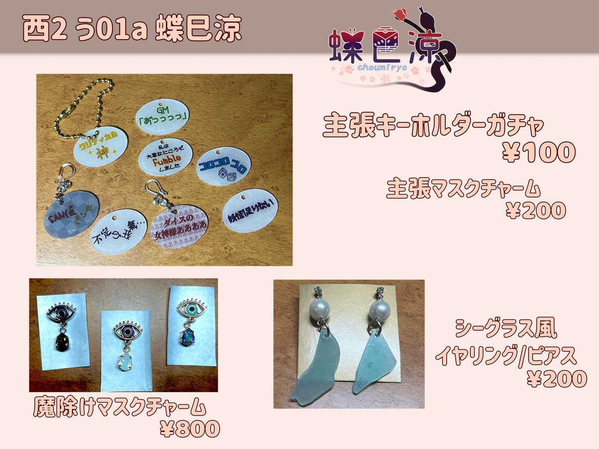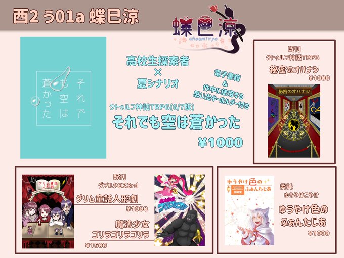 蝶巳涼お品書きです!! 新刊はクトゥルフ神話TRPGのシナリオ集! 既刊はダブルクロス2種とクトゥルフのシナリオ集です 委託本はゆうやけこやけです また主にクトゥルフ神話TRPGにちなんだハンドメイド作品も持っていきます! 各種電子決済をご用意しているのでお気軽に来てください✨ #C99 #TRPG
