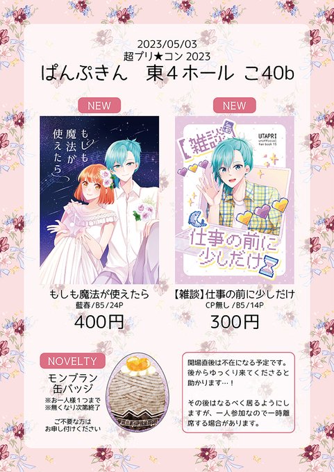 10 20 5/3 超プリ★コン 2023 お品書き 久々のプリコン!新刊2冊+ノベルティがあります🫶 開場直後はお買い物に行かせてください…!当日楽しみです🥰 新刊サンプルはツリーに貼ります。 23/04/23 19:53