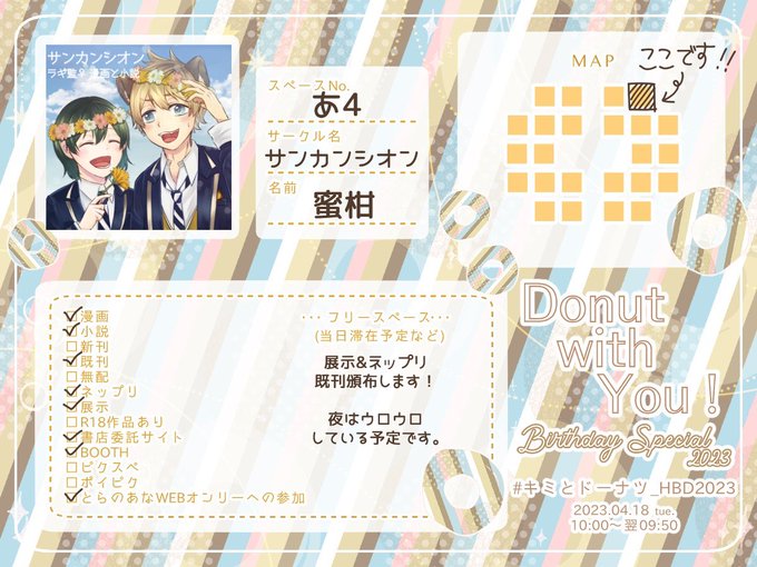 4/18開催のラギ監♀オンリーに【あ4 サンカンシオン】で参加します! 「春夏秋冬とお花」をテーマにした4枚のイラスト・💐バースデーのイラストの展示&ネップリと、既刊頒布します。 お品書きはツリーに繋げます! #キミとドーナツ_HBD2023