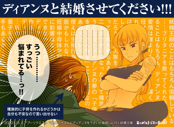 19 86 エアスケブ③マトローナさんにディアンヌを下さいと挨拶しに行く妖精王様 読みにくい文字を読まないと理解できない絵ですみません!!楽しかったです!ありがとうございました〜! (マシュマロ@tosでお返事します) 20/05/13 02:30