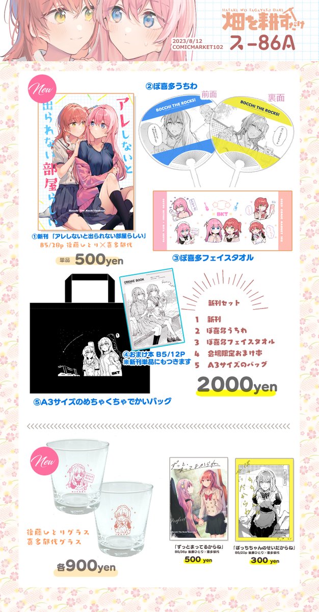 181 686 夏コミのお品書き。ぼ喜多本やグッズなどを持っていきます。東4/ス86a「畑を耕すだけ」当日はよろしくお願いします。 23/08/06 20:13