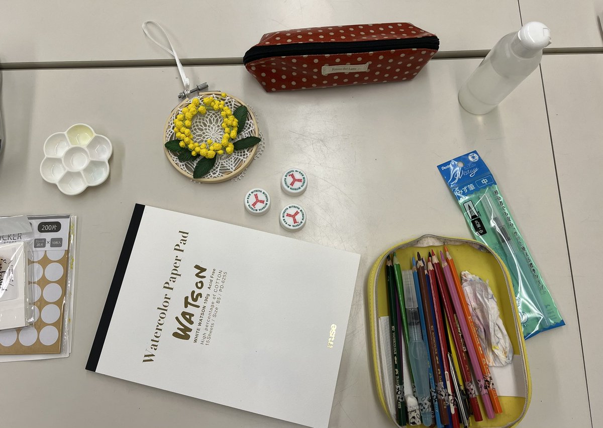 【#水彩色鉛筆イラスト講座🍊】 寒い雨の日、受講下さった方、体験の方、見学の方と #水彩時間 を楽しみました。テーマは『#ミモザ』。左上にあるミモザはクレイクラフト作家さんの作品✨ ハガキやシール、カードに描いて…他も作品にもチャレンジ! 皆さん楽しまれてましたよー! 帰り道の桜も綺麗📸
