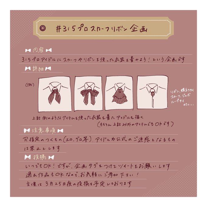 #315プロスカーフリボン企画 企画立てます! 自由参加なので期限なし、いつでも、過去絵でもOK タグをつけてご投稿ください その他の追記事項などがあればツリーに繋げていきます 気軽にご参加ください🎀