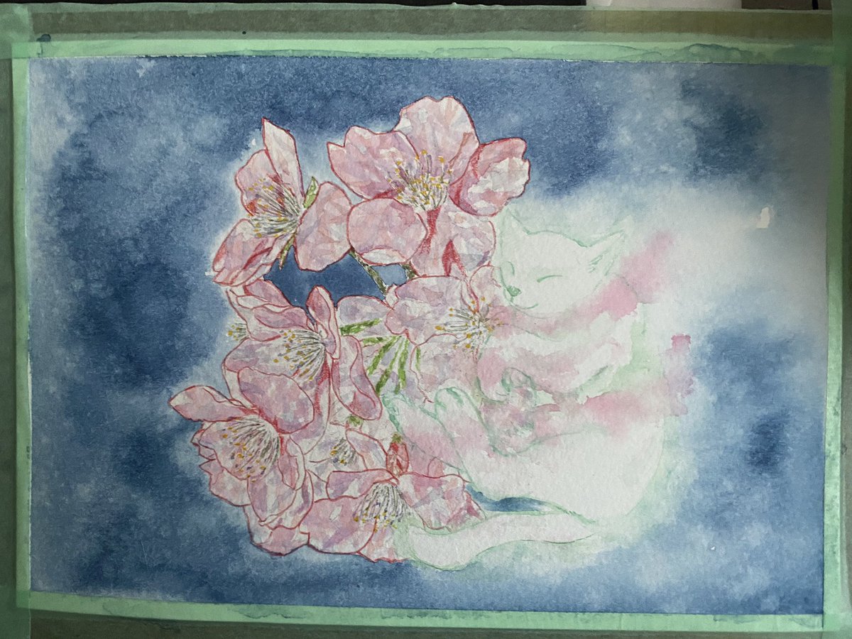 少しずつ桜を濃くしてって、 ホワイトとキラキラを入れたら完成です_(^•ڡ•^_ )_ #絵 #イラスト #illustration #水彩 #Watercolor #植物 #ガチ制作会 #彩る風の物語