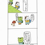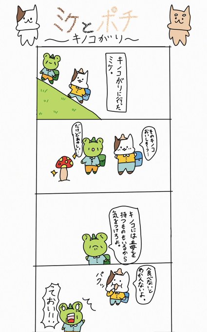 11 300 ミケ危ないよ…💧 #4コマ漫画 #ミケとポチ #ゆるいイラスト #ゆるいマンガ #猫 #きのこ狩り #カエル爺さん 23/03/30 21:49