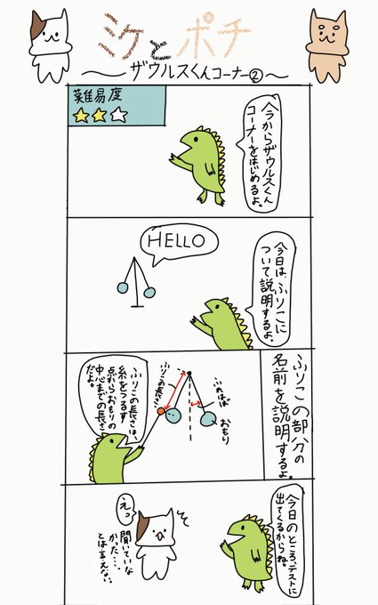 9 345 レアキャラ、ザウルスくん登場🦖 #4コマ漫画 #イラスト #ゆるいイラスト #ゆるいマンガ #ミケとポチ #猫 #恐竜 #ふりこの原理 23/04/03 21:19