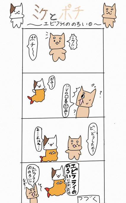 6 292 昨日の続き🍤 #4コマ漫画 #イラスト #ゆるいイラスト #ゆるいマンガ #猫 #ミケとポチ #エビフライの呪い 23/04/07 19:23