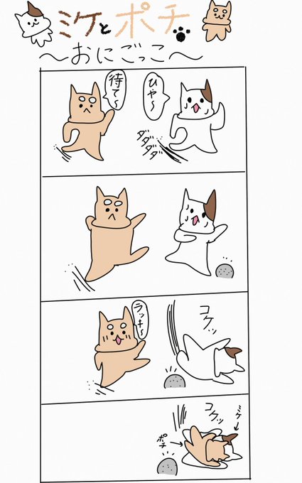 昔の作品の再ツイートです! 記念すべき第一回目の漫画です♫ #4コマ漫画 #イラスト #ゆるいイラスト #ゆるいマンガ #猫 #ミケとポチ #おにごっこ