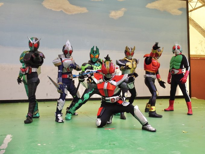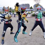 かしいかえんラスト。たくさんの仮面ライダーが集合しました!クウガ、アギト、ブレイド、ダブル、ガタキリバ、電王、オーズ、新1号、新2号 写真ありがとうございます! @sonjin4545 @sk_camera @shioru05 #あに花 #かしいかえん コスプレ注意