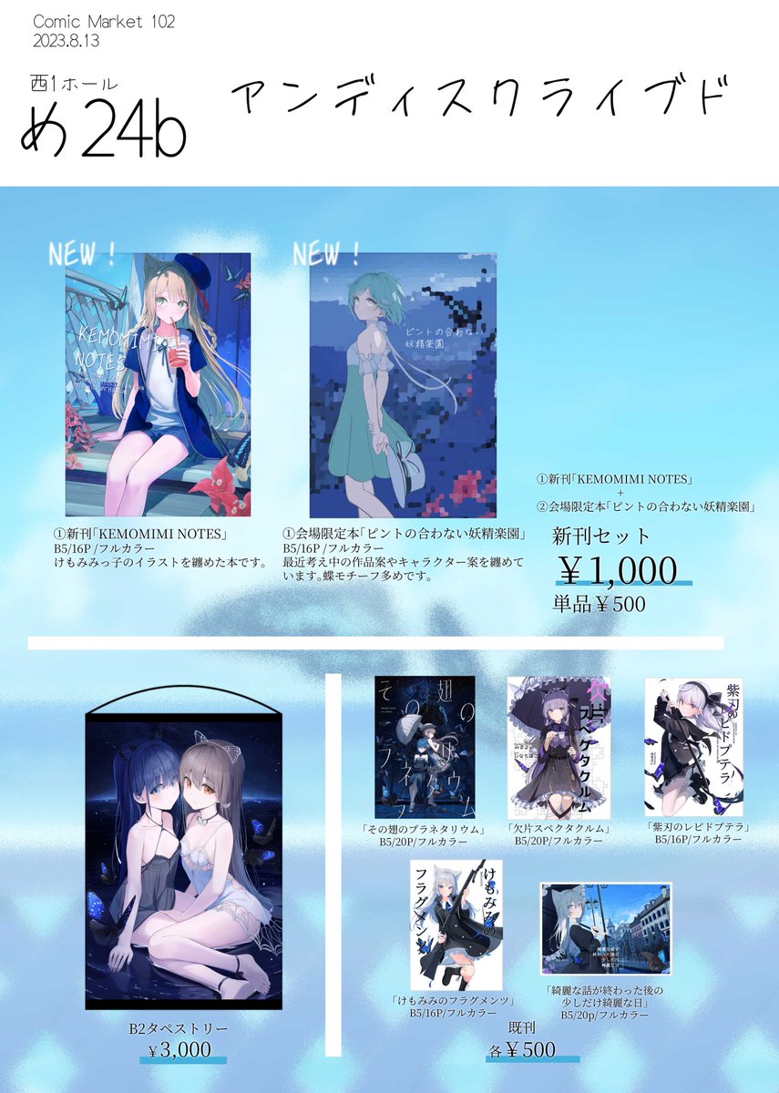 8月13日、#C102 サークル「アンディスクライブド」お品書きです! 新刊はけもみみイラスト本と、制作中の作品案を纏めたラフ本です!スペースは「西1ホールめ24b」、よろしくお願いいたします! メロンブックス委託通販ページ→melonbooks.co.jp/detail/detail.…