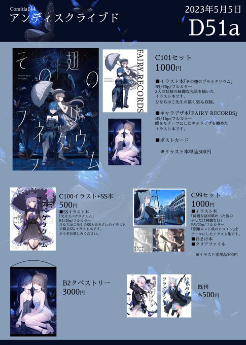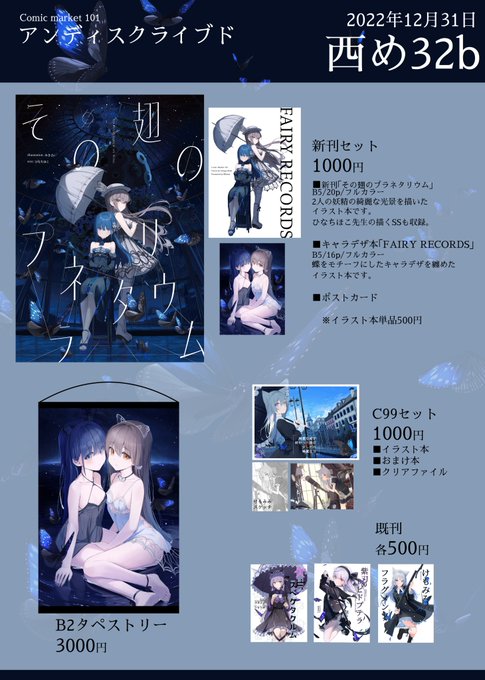 #c101 お品書きです! 新刊「その翅のプラネタリウム」は蝶をモチーフにした二人の女の子のイラスト集です。なんと、ひなちほこ(twitter.com/hinachihocco)先生のSSも収録されています! 新刊はメロンブックス様で委託販売もしておりますので、何卒よろしくお願いします! melonbooks.co.jp/detail/detail.…