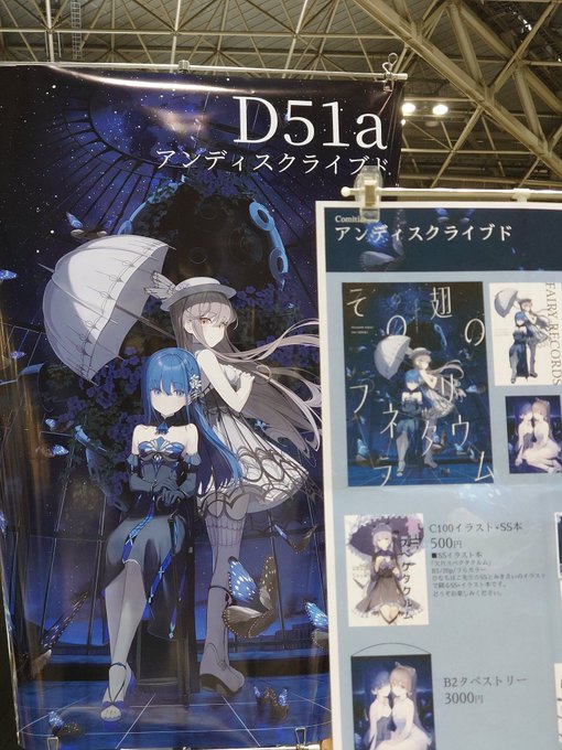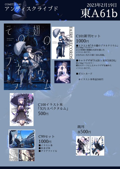 2月19日の #COMITIA143 のお品書きです! 今回はC101の新刊「その翅のプラネタリウム」を中心に持っていきます。蝶をモチーフにした二人の女の子のイラスト本です。 スペースは「A61b」、サークル「アンディスクライブド」です。 何卒、よろしくお願いします!