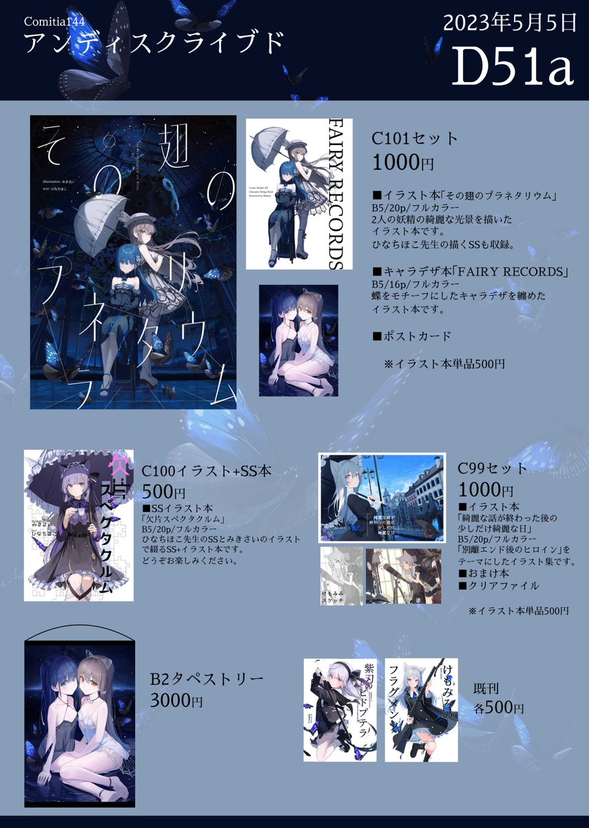 5/5の #コミティア144 お品書きです! C101で制作した「その翅のプラネタリウム」を中心に既刊とタペストリーを持っていきます。 「その翅のプラネタリウム」は蝶をモチーフにしたイラスト本で、ひなちほこ(twitter.com/hinachihocco)先生のSSも収録。 スペースは「D51a」、よろしくお願いします!